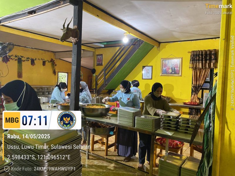 Kegiatan yang berlangsung pada Rabu, 14 Mei 2025, dimulai pukul 07.10 WITA, mencakup pengolahan, pengepakan, dan distribusi makanan bergizi ke 12 unit sekolah di Kecamatan Malili. Program ini merupakan salah satu upaya nyata dalam mendukung peningkatan kualitas gizi dan kesehatan peserta didik di wilayah tersebut.